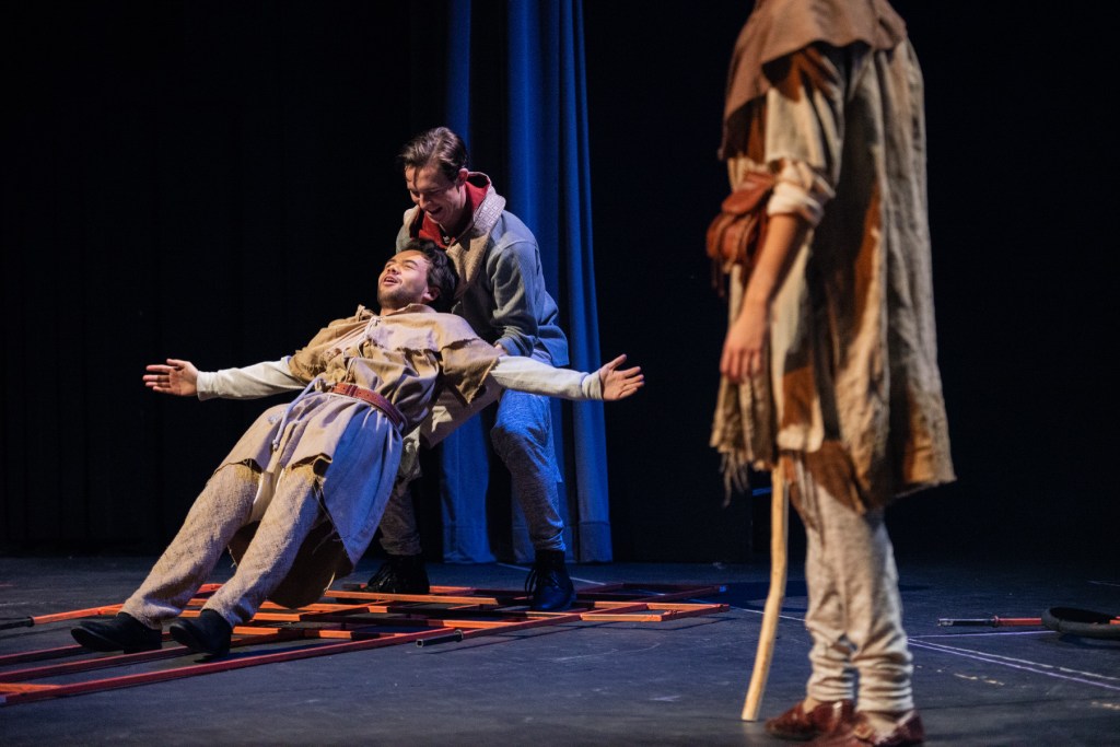 It’s like being inside a highly populated Brueghel painting and the stern, good and evil drama of Blake’s images thanks to lighting designer Bruce MacLennan, set and projection designer Karyn McCallum, sound designer/composer Alex Arnold and costume designer John Pennoyer, who has outdone himself with the aid of many student cutters and stitchers. (The angel’s wings alone are amazing.)