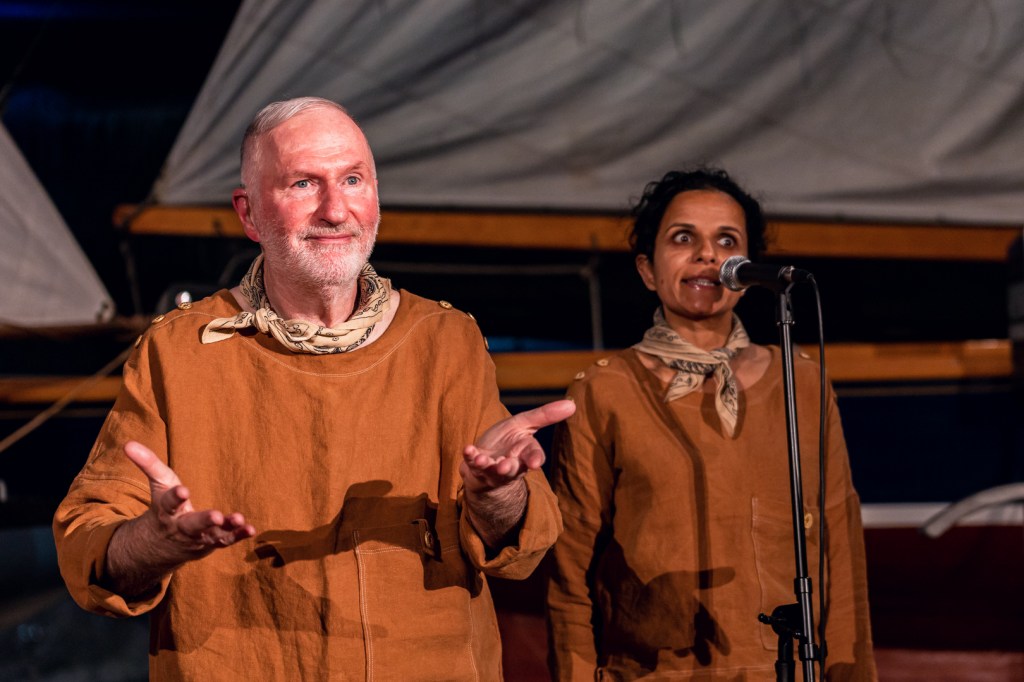 Amazingly, At This Hour is accessible to both deaf and blind or partially sighted audiences with the pairing of hearing and deaf actors, with Brian Riley’s great sound design and with surtitles and images projected onto sails. This style also enlivens the show for a hearing audience. I’ve never seen anything like it.