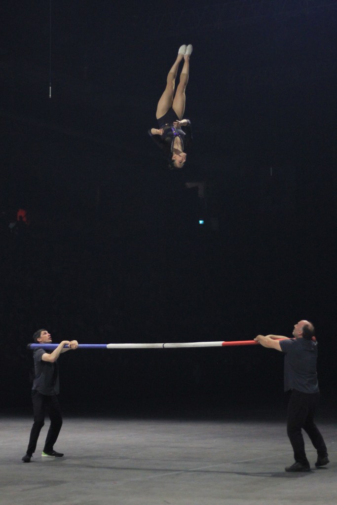 It’s amazing how a large marching band can slip off stage and suddenly all 10,000 eyes are focussed on just one slim woman with two red silks that hang from the ceiling as Anastasia of Atlantic Cirque performs a rivetting and dangerous balletic act.