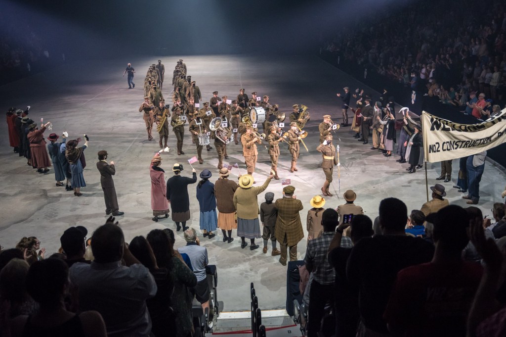 The soldiers’ descendants march on stage in the battalion’s distinctive, plain khaki uniform as actors cheer and wave white handkerchiefs to make up for the lack of fanfare when the battalion returned quietly to Pier 21 in 1919.