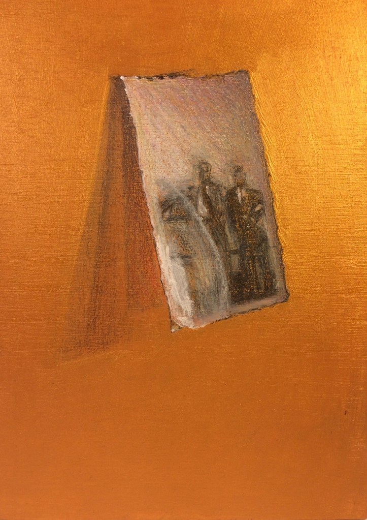 McKinnon pins the family photographs – white, scalloped-edged black and whites of the 1950s and 1960s – to a board and focusses in on the shadows they create. His intent is to make them look “like they will blow away.”