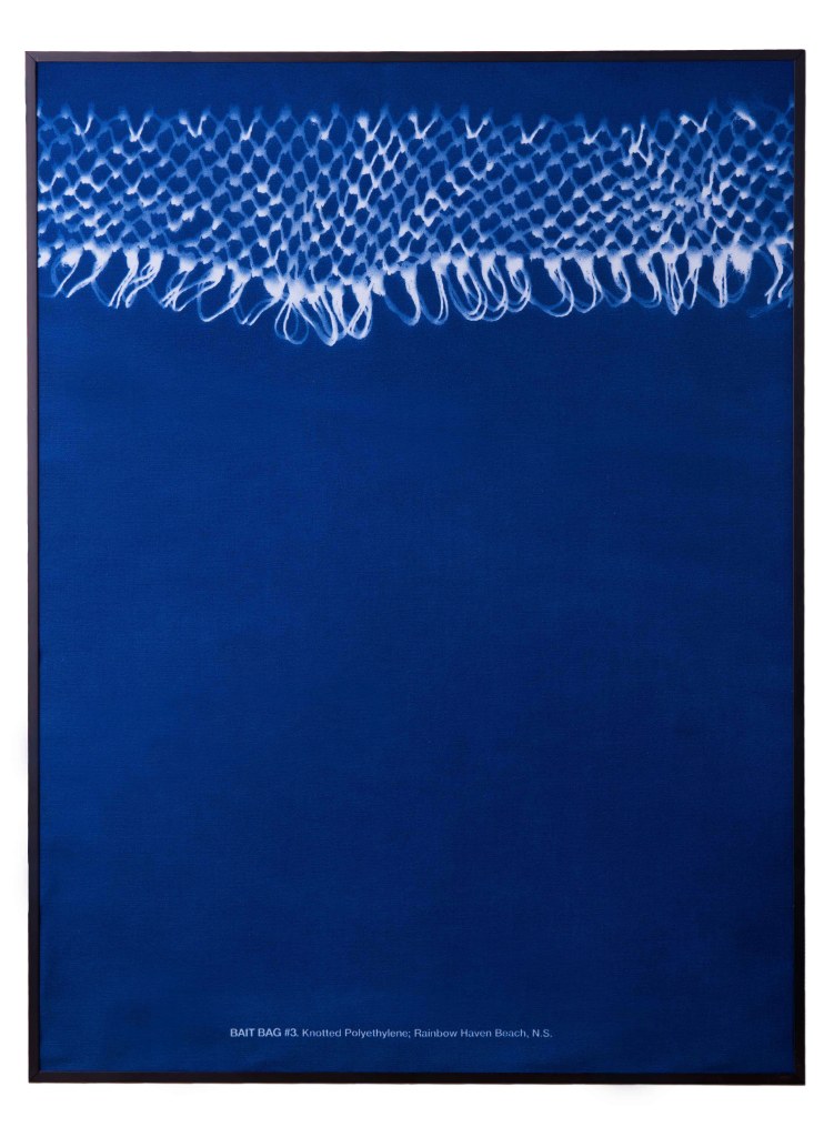 The saturated and dreamy blue of O’Dowd’s contact print cyanotypes suggests a deep ocean in which a ghostly piece of net floats in its own universe; these works are lovely, haunting and disturbing. The concept for this Bait Bag series “both emulates and subverts” how British botanist, photographer and cyanotype pioneer Anna Atkins documented her collected dried-algae in 1842, says O’Dowd.