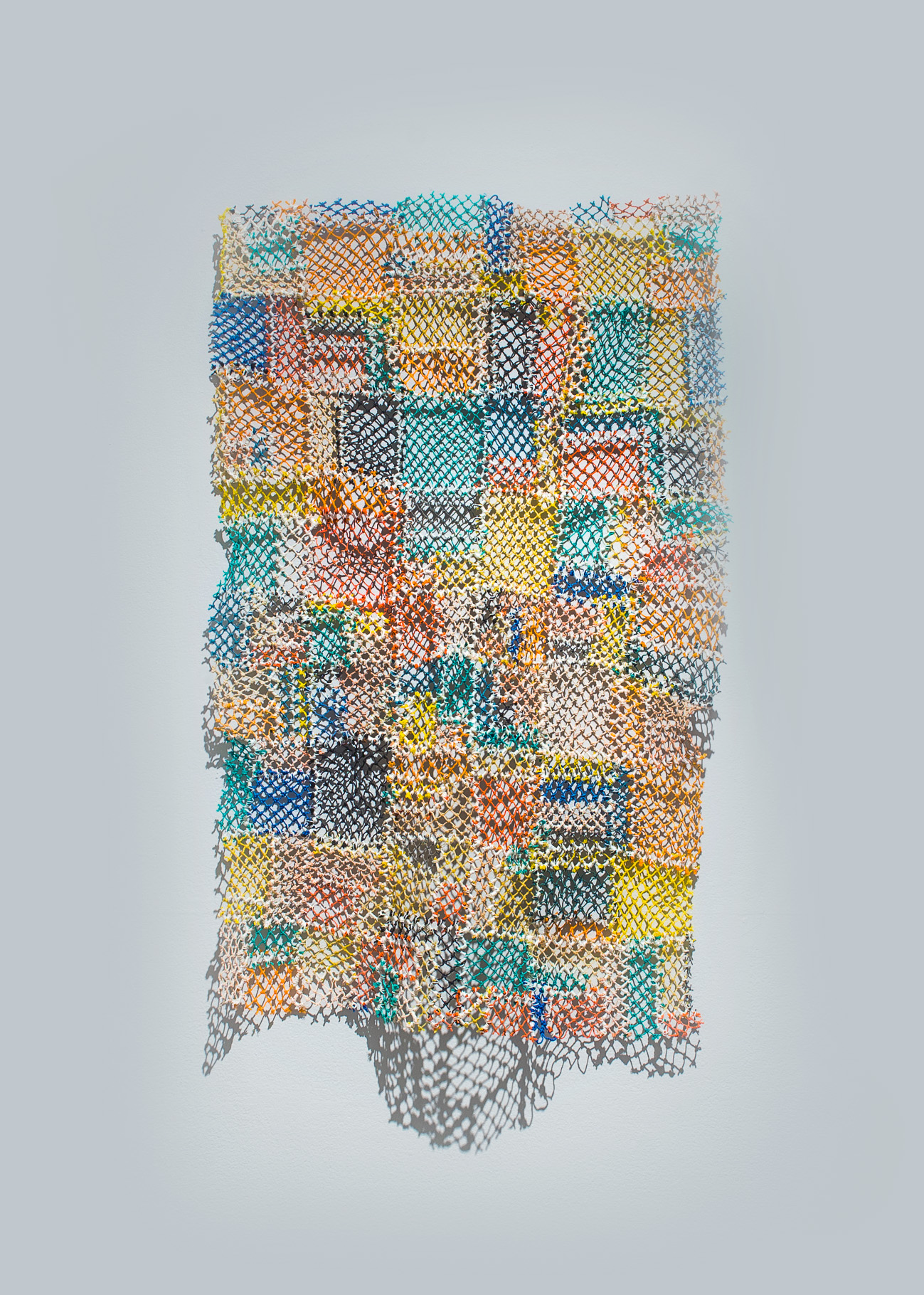 Irrational Repair; May 2021-Present, of reclaimed bait bags and twine, is a lineup of delicate-looking pieces of netting mended in all sorts of textile techniques. They look abstract and magically like lace.