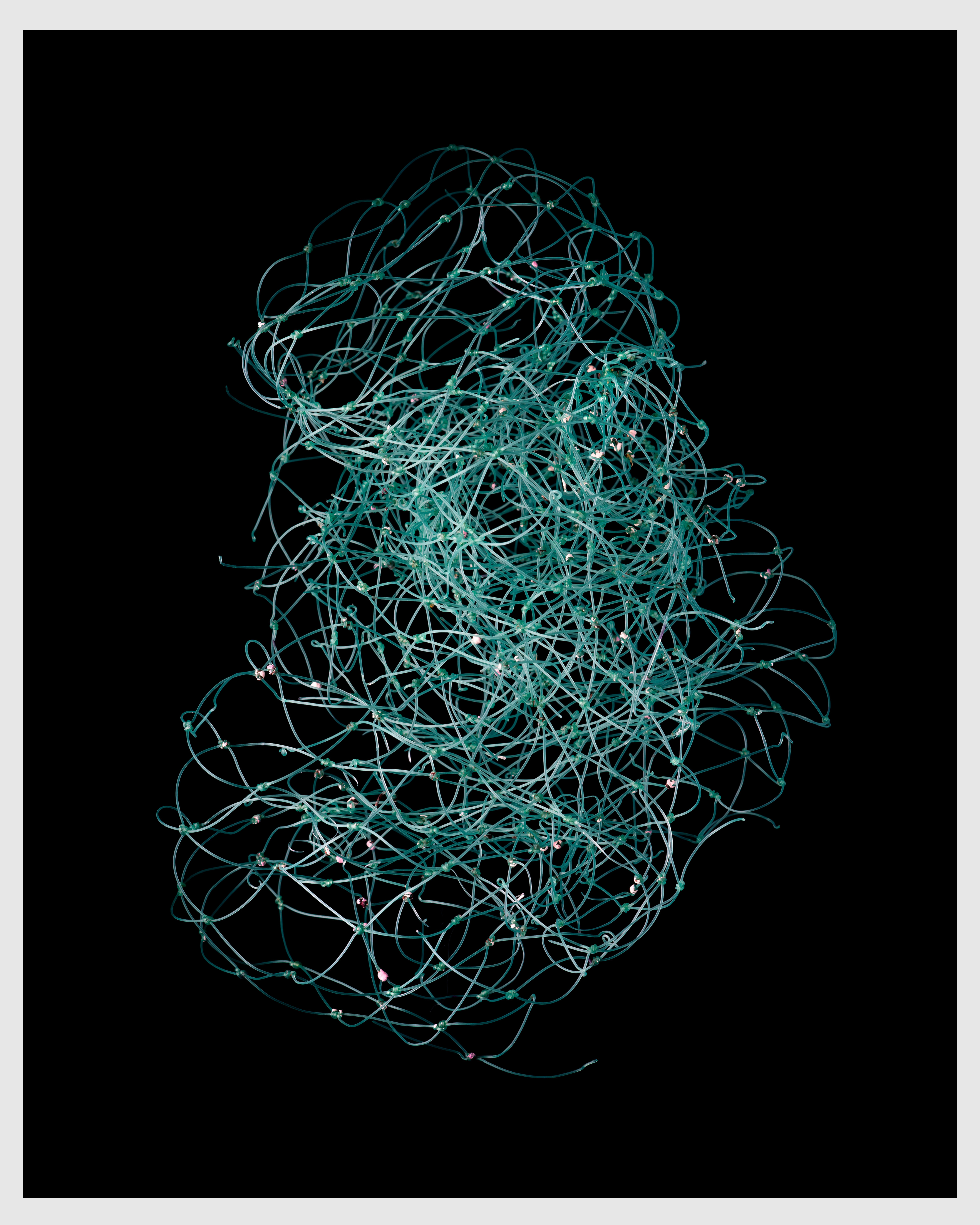 These are high-resolution portraits of specimens of washed-up fishing debris from the Nova Scotia shore. In keeping with scientific cataloguing, O’Dowd hangs them from a thin fishing line and rotates them in space like mobiles.