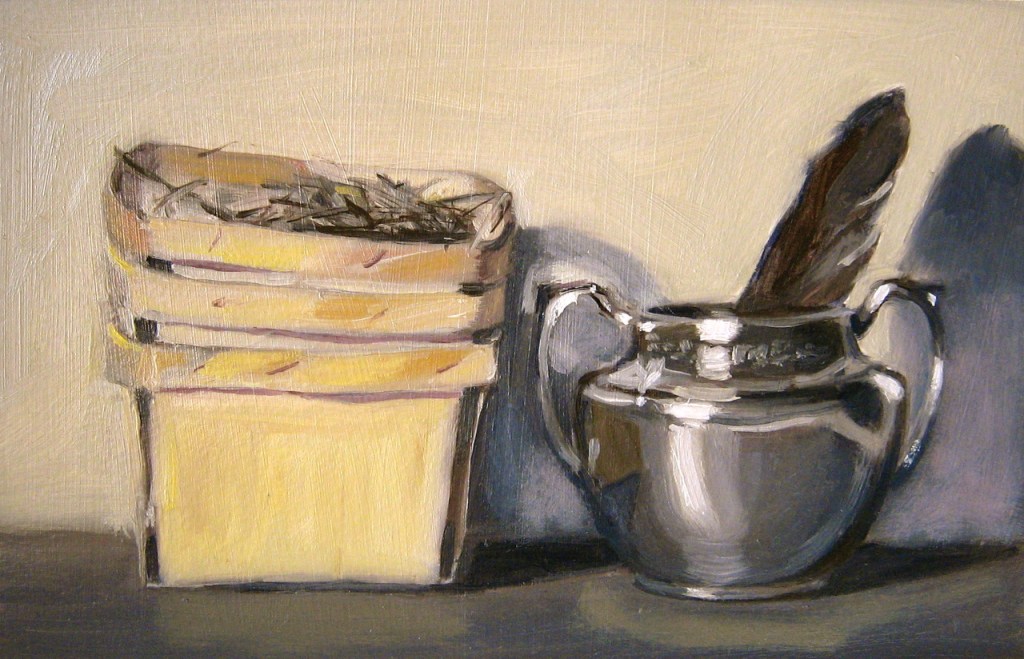 Her containers “represent the physical mind and how it functions as it holds, or fails to hold, those memories. The depiction of objects in reflective surfaces introduces another level of symbolism by speaking to the mental act of, literally, reflecting.” Her intent is to create a visual metaphor “for how the mind looks at the moment when something is remembered or forgotten.”