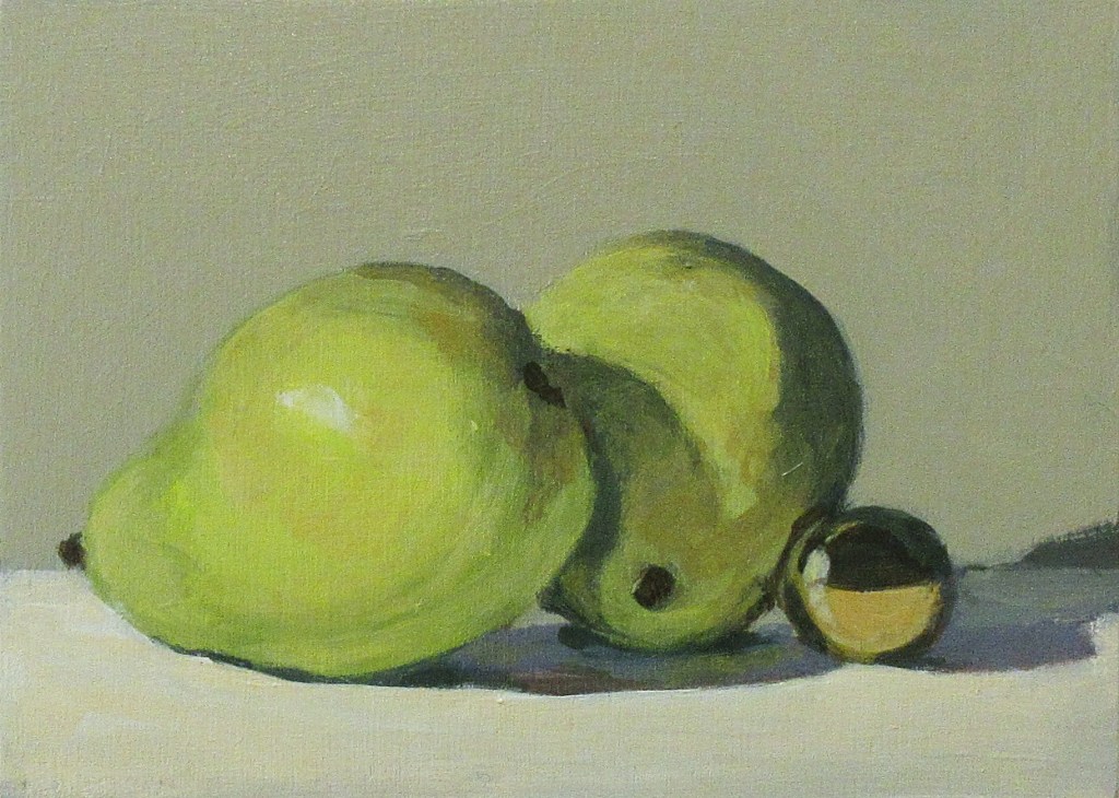 Reardon’s minimalist still life paintings, in a pale palette, are atmospheric, theatrical sets of recurring objects placed sparingly in a vast, deliciously-open space, against a sky or a wall, or on the palest beach sand.