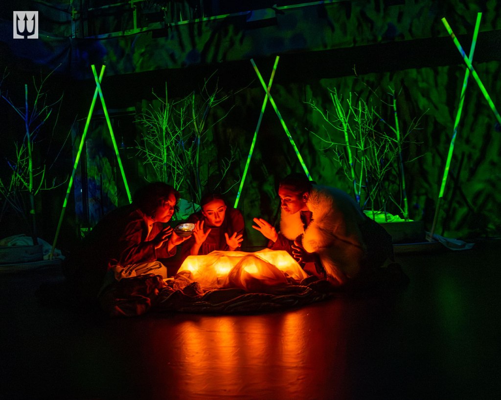 The wigwam, with a smoke hole so its occupants can see up to the heavens, is conjured on stage by standing sticks pushed together in triangular forms. A giant moon hangs at the top of the stage above the wigwam and is a canvas for ever-changing projections of moons, stars, Northern lights and a blizzard. The fire is an ingenous floor construction of lights that with the sound of crackling seems to give off real heat and sparks.