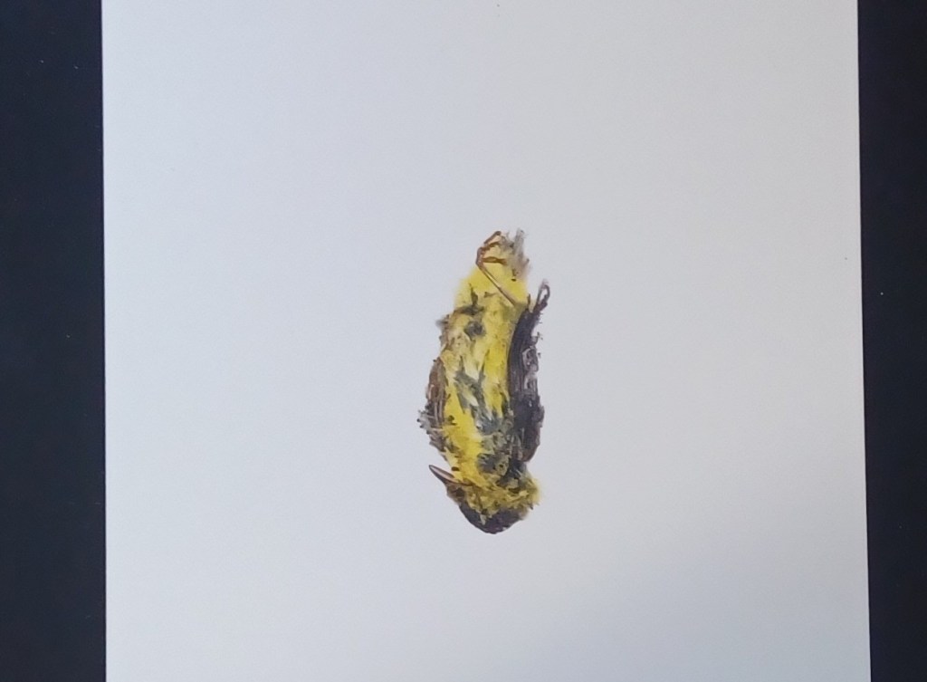 The show then unfolds to make people throughly understand the depths and nuances of this tragedy through music, giant puppetry and movement before Harry Thurston reads his masterful poem. By this time people are opened up sensually and emotionally to take in all his descriptions, metaphors and analysis of industrial greed and environmental disaster. The experience during this reading – even on a beautiful summer night of ocean breezes and rustling leaves – is one of pain. At the end one of the “birds” gives me a Holownia photograph of a dead yellow songbird as a memorial gift and I don’t want to take it (though, of course, I do).
